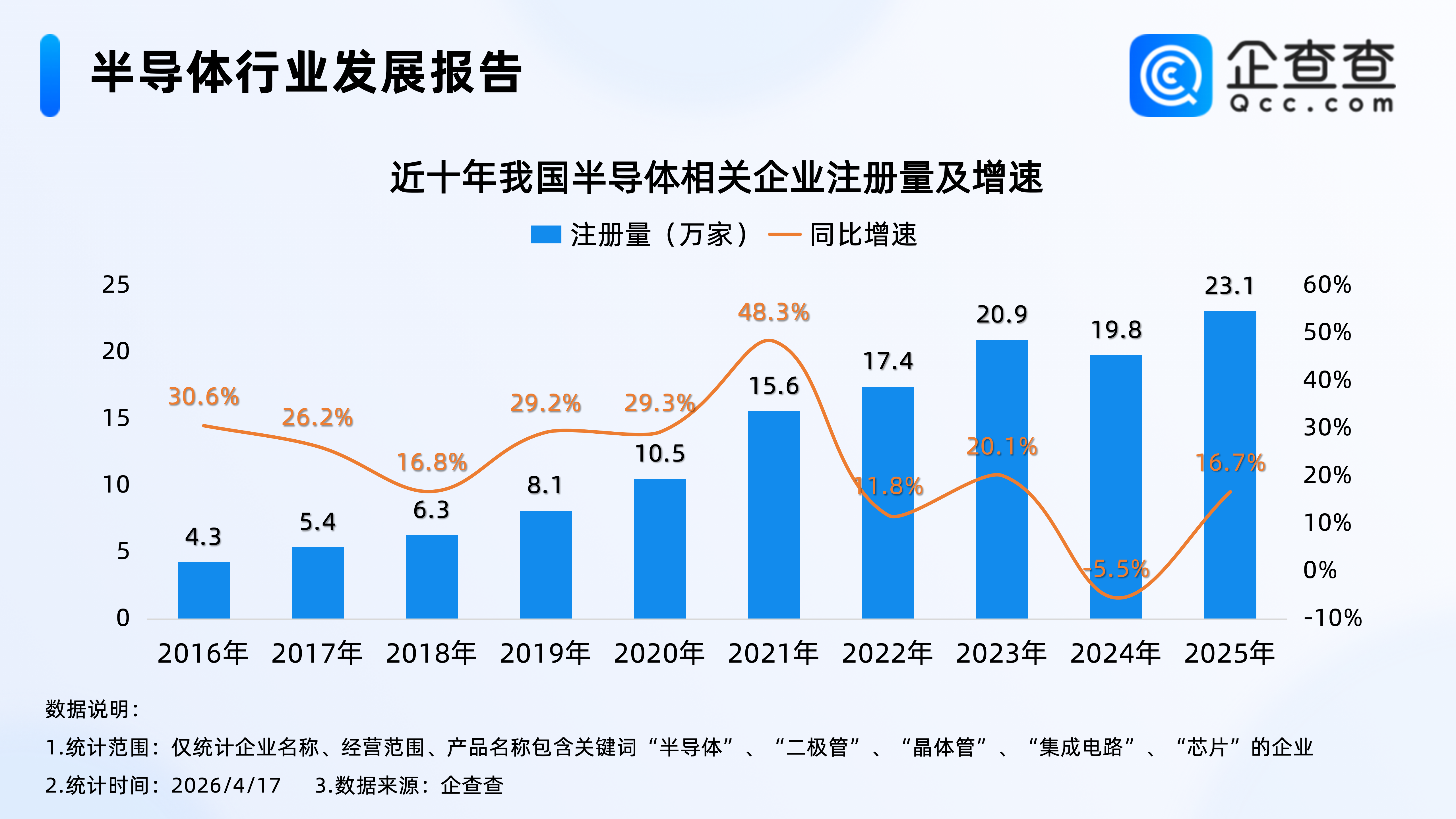 企查查数据显示,近十年,我国半导体相关企业注册量基本逐年增加,其中2021年注册量同比大幅增加48.3%至15.6万家,达近十年注册量增速峰值,2025年全年,我国累计注册23.1万家半导体相关企业,同比增加16.7%,创近十年相关企业注册量新高美女背景私照片。截至4月17日,2026年我国已注册5.9万家半导体相关企业漂亮美女私照片。