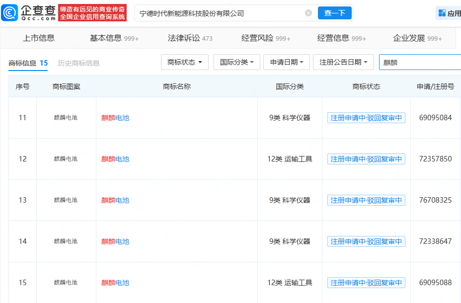 企查查APP显示,宁德时代已申请注册多枚“麒麟”、“麒麟电池”、“时代麒麟”商标,国际分类包括运输工具、科学仪器等美女网名。