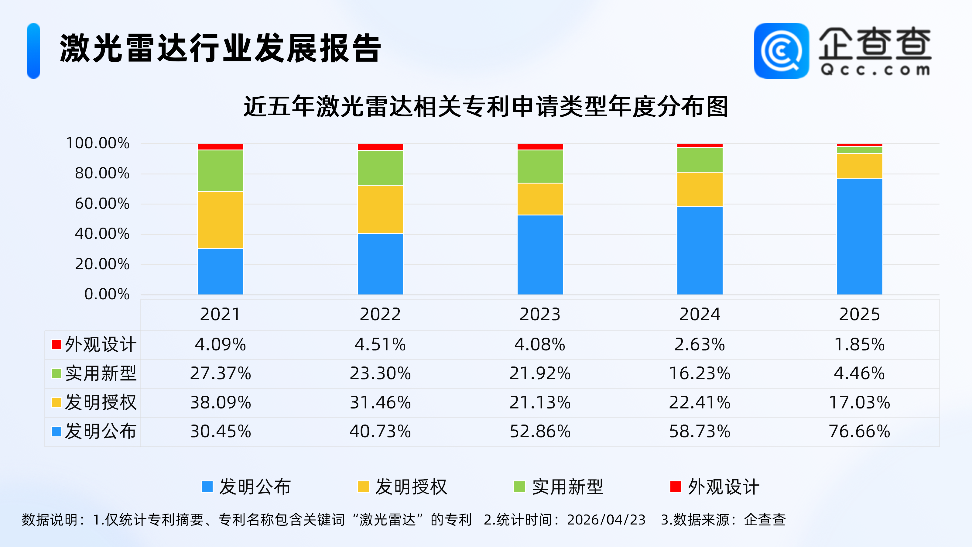 企查查数据显示,近五年每年激光雷达申请专利中,发明专利占比持续提升美女网名昵称可爱。其中,发明公布类专利占比从2021年的30.45%飙升至2025年的76.66%,占比提升近50个百分点,成为专利申请类型的绝对主力死亡直播。实用新型与外观设计专利占比持续下降,外观设计专利2025年占比已降至1.85%,行业专利结构从“数量扩张”向“质量提升”转型,核心技术创新能力显著增强伤感女生背景图。
