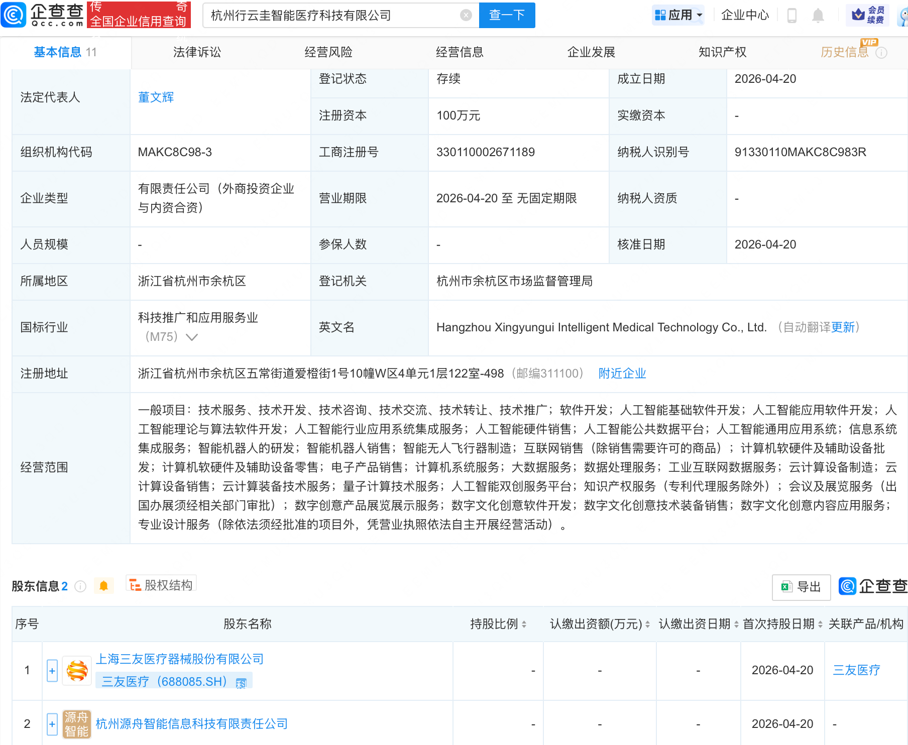 企查查APP显示,近日,杭州行云圭智能医疗科技有限公司成立,经营范围包含:人工智能硬件销售;人工智能公共数据平台;人工智能通用应用系统;智能机器人的研发;智能机器人销售;智能无人飞行器制造等性感表情包。企查查股权穿透显示,该公司由三友医疗(688085)等共同持股性感照片私照片女生背影。