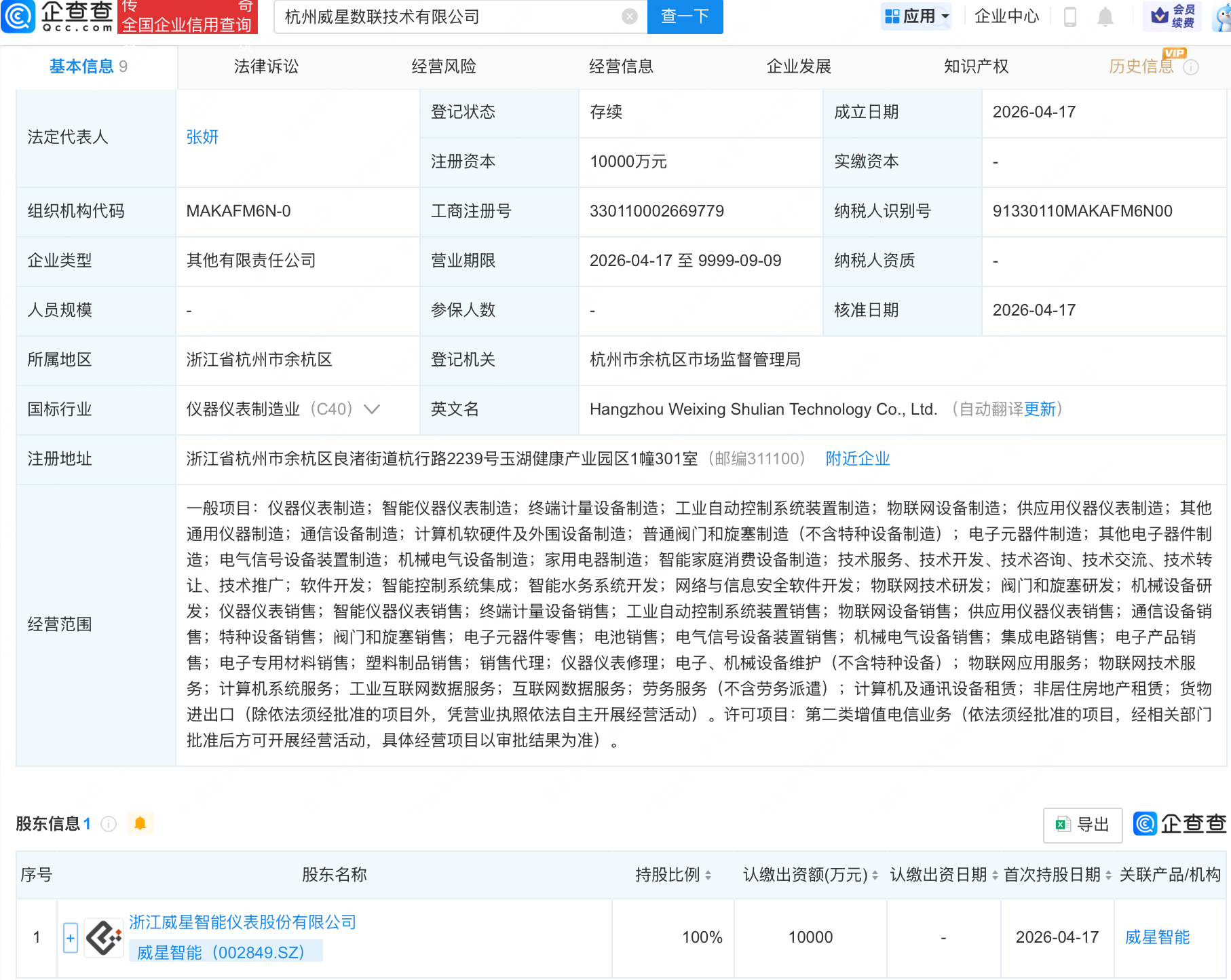 企查查APP显示,近日,杭州威星数联技术有限公司成立,注册资本1亿元,经营范围包含:智能水务系统开发;网络与信息安全软件开发;物联网技术研发等什么文案容易上热门。企查查股权穿透显示,该公司由威星智能(002849)全资持股高级感美女图片大全。