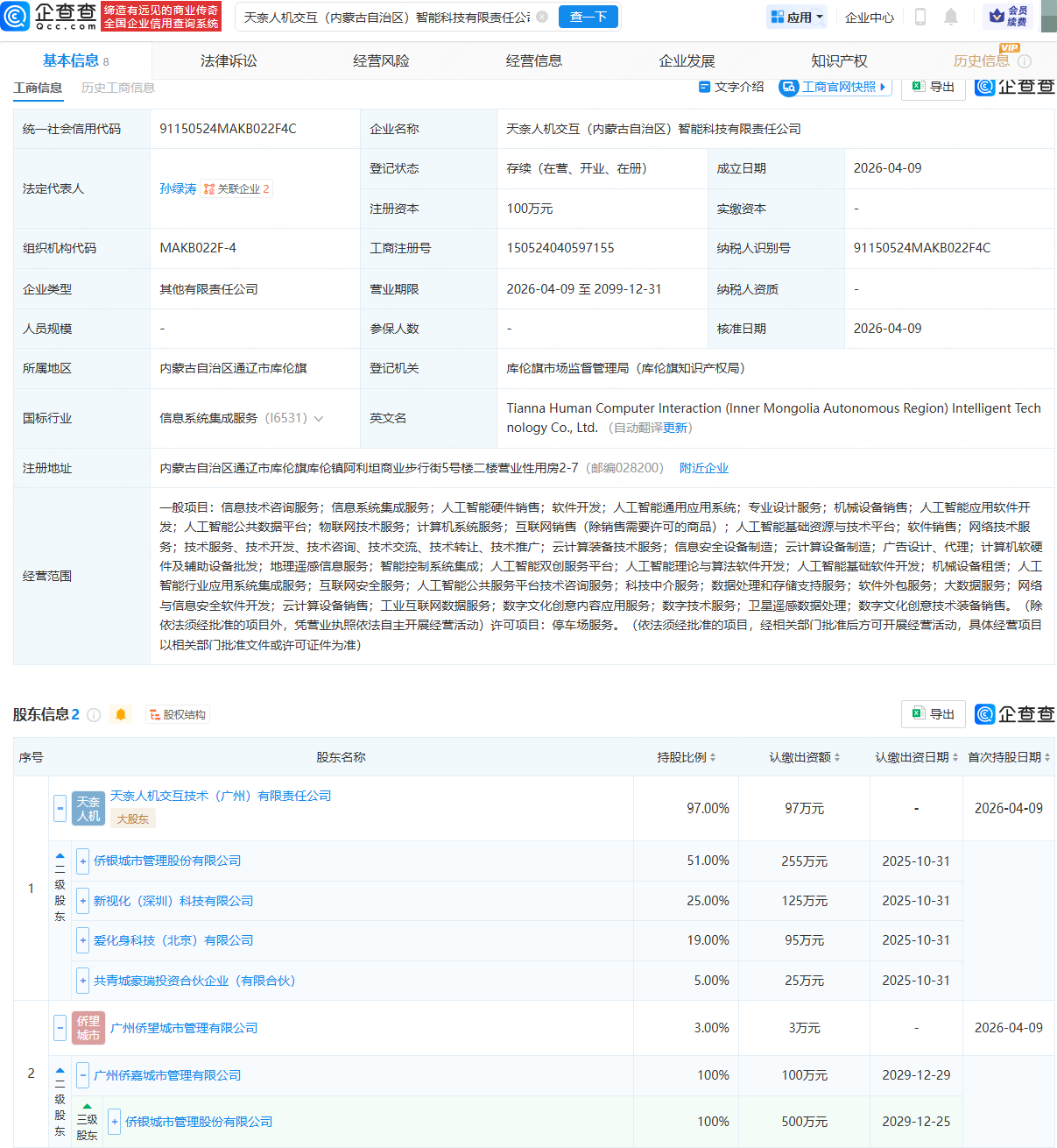 企查查APP显示,近日,天奈人机交互(内蒙古自治区)智能科技有限责任公司成立,法定代表人为孙绿涛,经营范围包含:人工智能通用应用系统;专业设计服务;人工智能应用软件开发;物联网技术服务;地理遥感信息服务等热巴绝美图片。企查查股权穿透显示,该公司由侨银股份(002973)旗下天奈人机交互技术(广州)有限责任公司及广州侨望城市管理有限公司共同持股陈都灵美图。