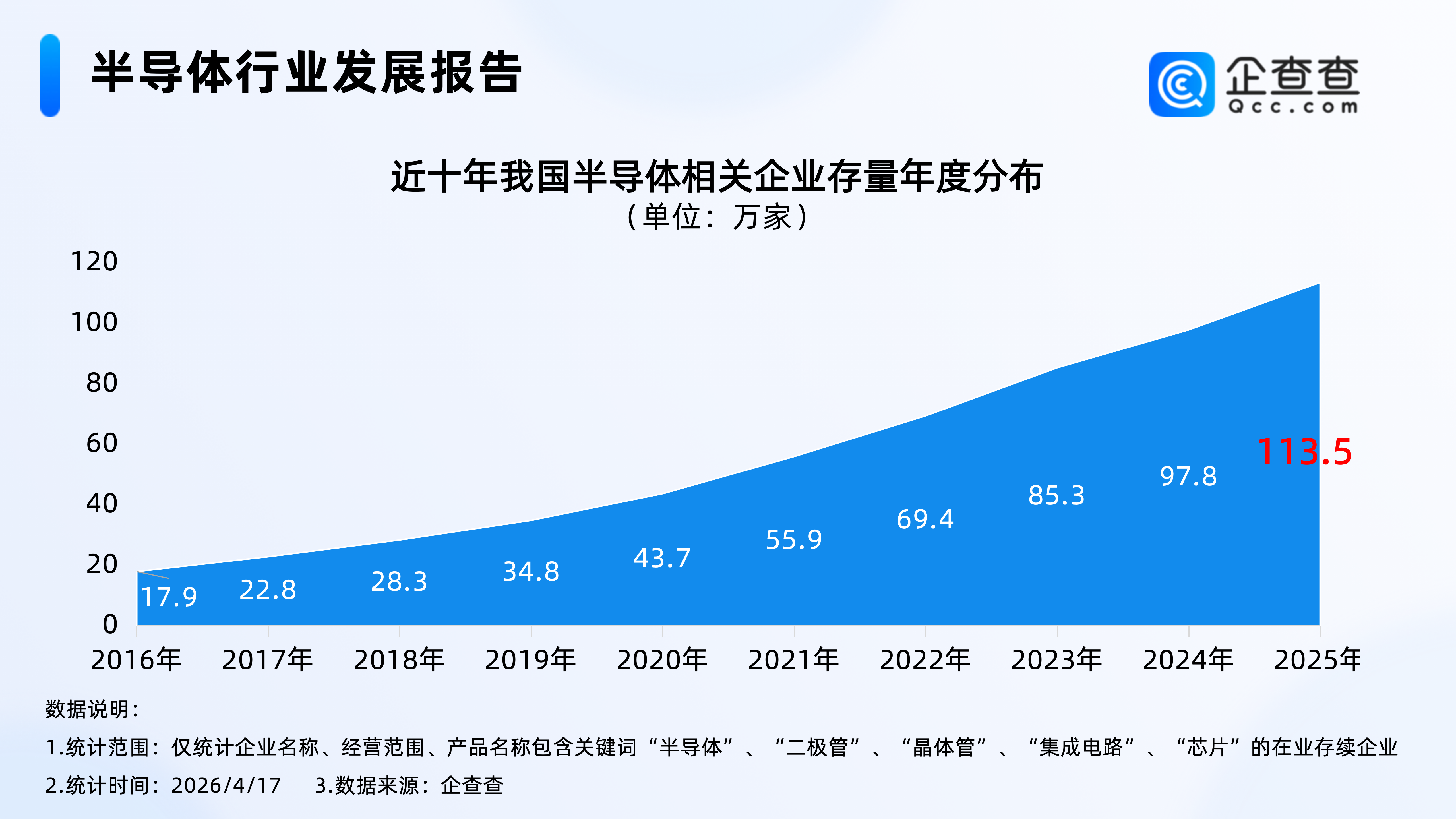 企查查数据显示,近十年,我国半导体相关企业存量逐年增加,2025年年底,我国在业存续半导体相关企业已超100万家,达113.5万家亿图库全景库下载。截至2026年4月17日,我国现存117.7万家半导体相关企业女生网图私照片。