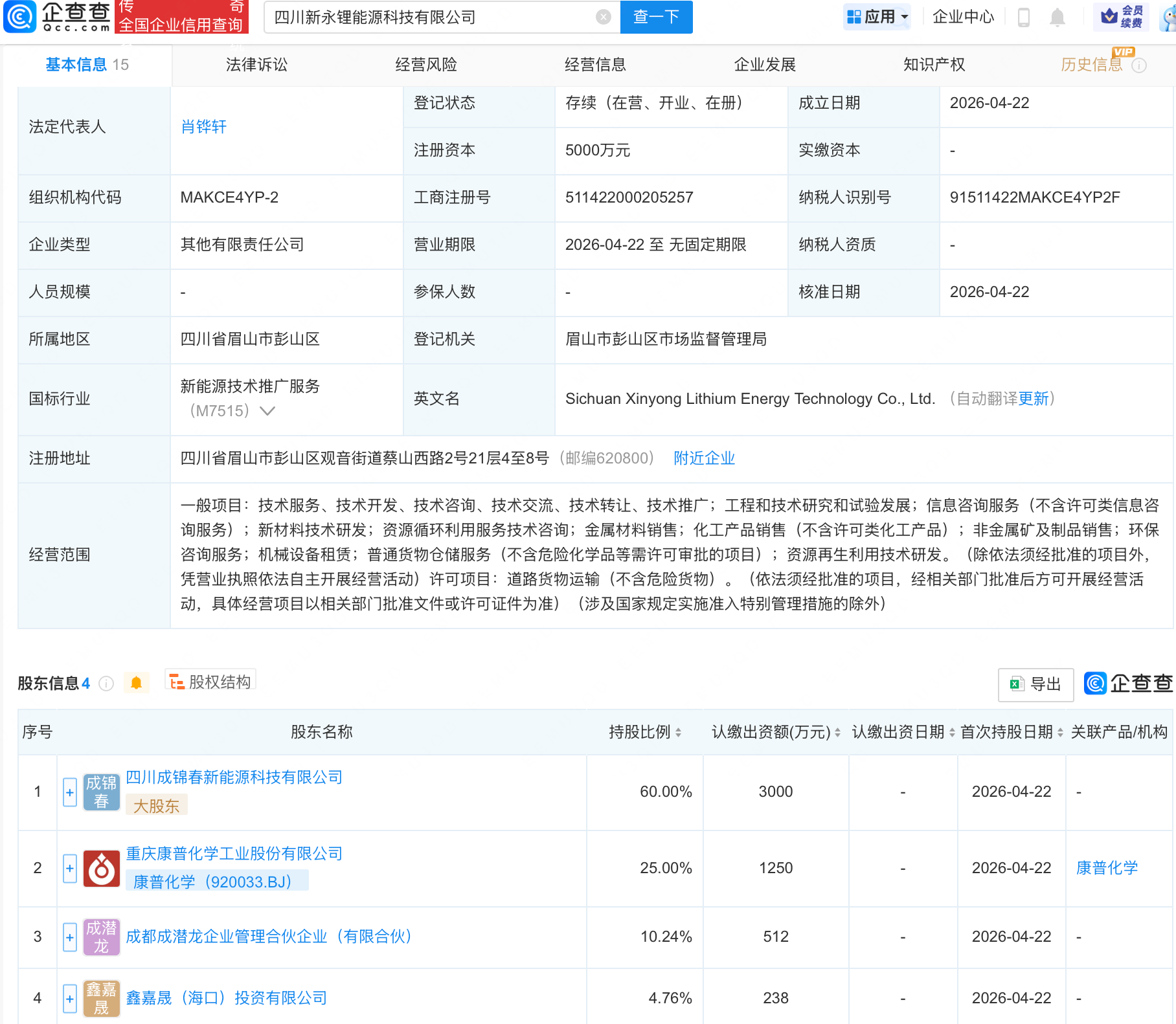 企查查APP显示,近日,四川新永锂能源科技有限公司成立,注册资本5000万元,经营范围包含:非金属矿及制品销售;环保咨询服务;机械设备租赁等好听的美女网名三个字。企查查股权穿透显示,该公司由康普化学(920033)等共同持股性感照片墙纸。