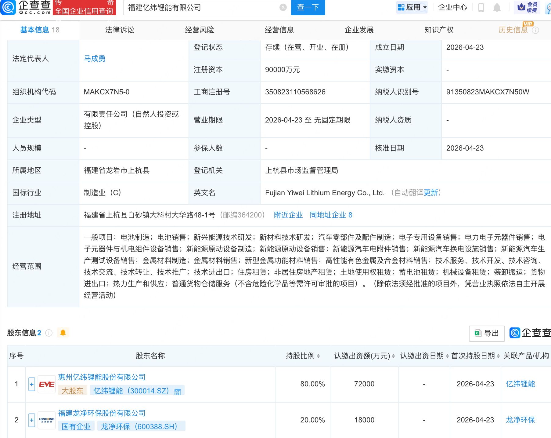 企查查APP显示,近日,福建亿纬锂能有限公司成立,注册资本9亿元,经营范围包含:电池制造;电池销售;新兴能源技术研发;新材料技术研发;汽车零部件及配件制造等陈都灵性感照片。企查查股权穿透显示,该公司由亿纬锂能(300014)、龙净环保(600388)共同持股网络流行对美女称呼。