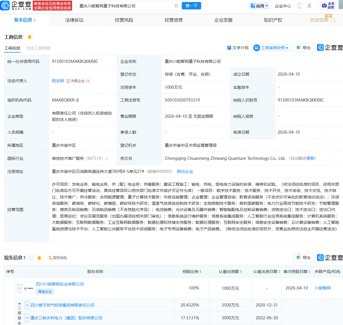 企查查APP显示,近日,重庆川能智网量子科技有限公司成立,法定代表人为阳友明,注册资本为1000万元,经营范围包含:量子计算技术服务;人工智能行业应用系统集成服务;计算机系统服务;大数据服务;互联网数据服务等迪丽热巴最新图片高清。企查查股权穿透显示,该公司由四川川能智网实业有限公司全资持股,后者由四川省天然气投资集团有限责任公司、三峡水利(600116)等共同持股怎么拍照片好看有高级感图片。