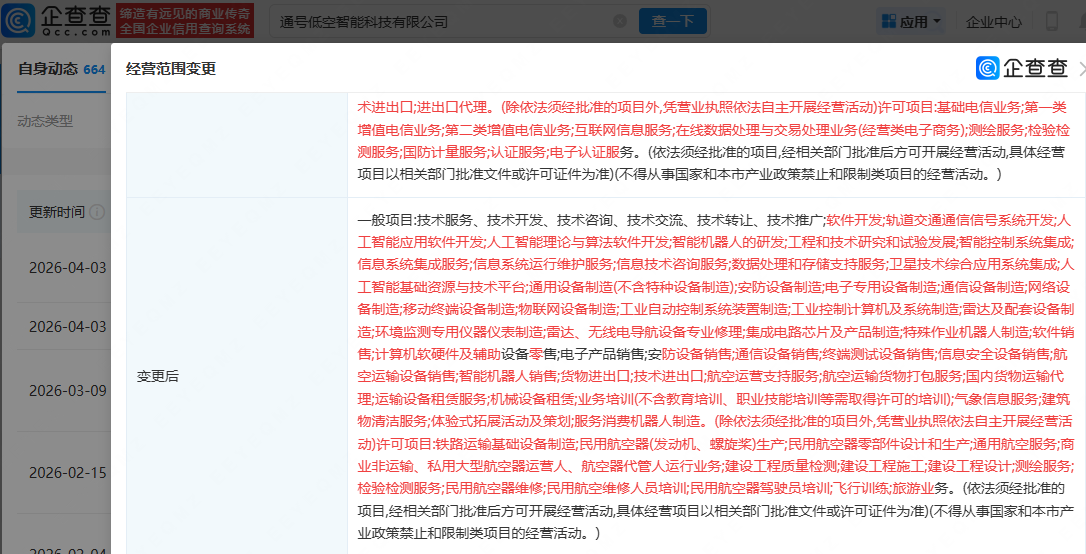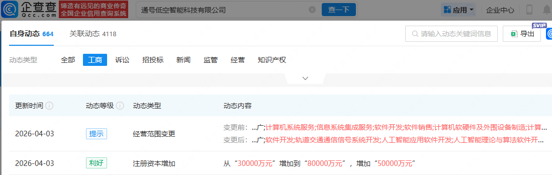 企查查APP显示,近日,通号低空智能科技有限公司发生工商变更,注册资本由3亿元增加至8亿元,增幅约为166.67%;同时经营范围变更为:人工智能应用软件开发;人工智能理论与算法软件开发;智能机器人的研发;卫星技术综合应用系统集成等性感的照片女生私照片。