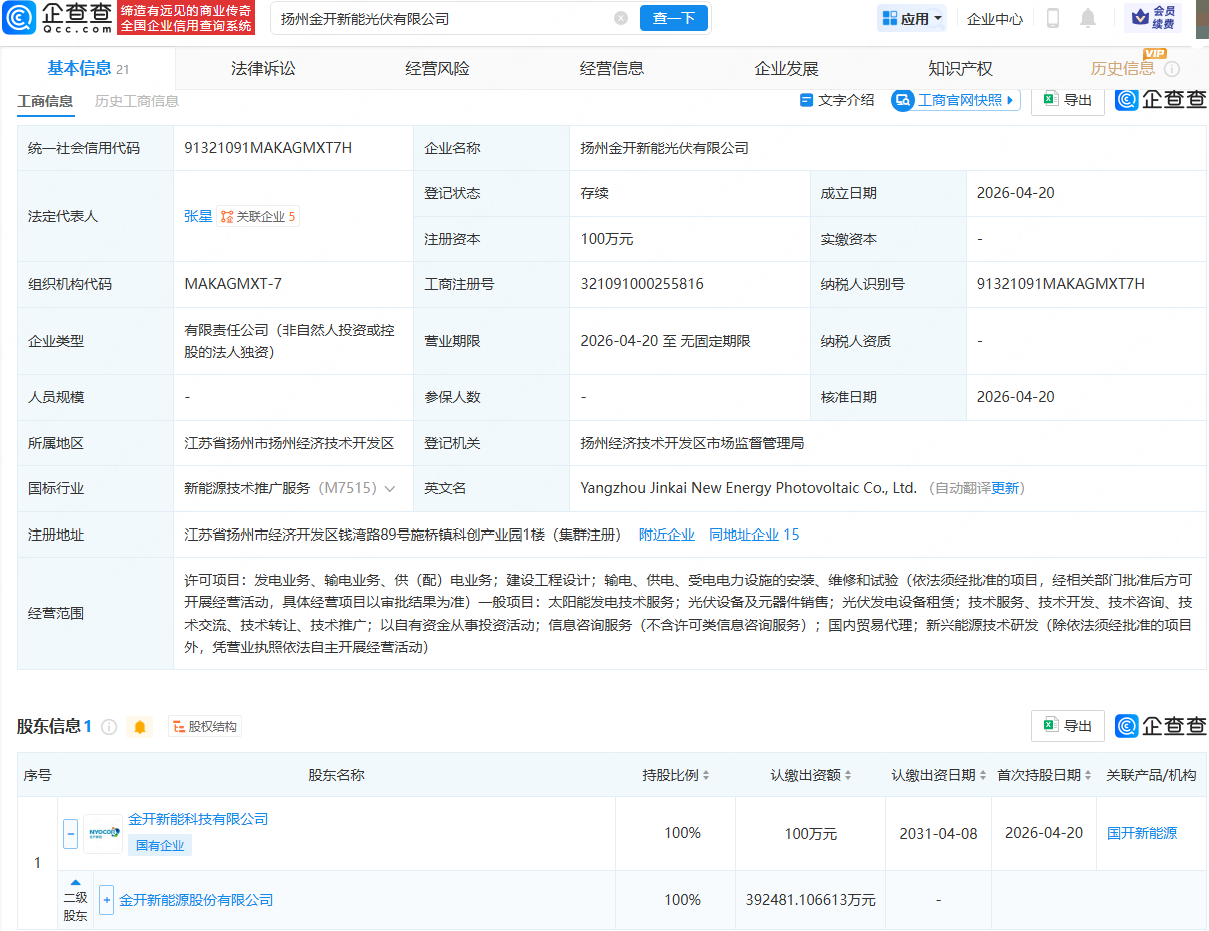企查查APP显示,近日,扬州金开新能光伏有限公司成立,法定代表人为张星,经营范围包含:发电业务、输电业务、供(配)电业务;太阳能发电技术服务;光伏设备及元器件销售等美女性感表情包。企查查股权穿透显示,该公司由金开新能(600821)间接全资持股美女在线观看免费高清版电视剧全集。