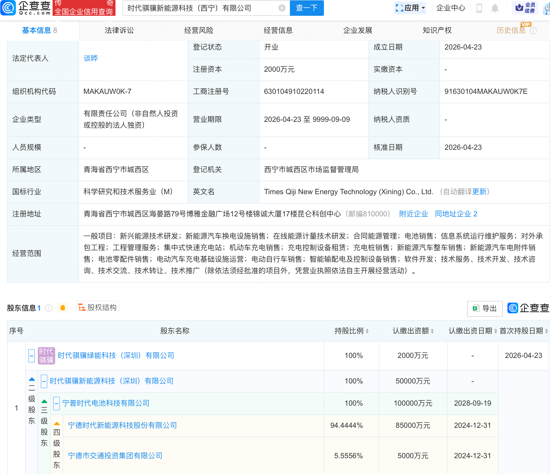 企查查APP显示,近日,时代骐骥新能源科技(西宁)有限公司成立,经营范围包含:新兴能源技术研发;新能源汽车换电设施销售;在线能源计量技术研发;合同能源管理;电池销售等mmm131 cn。企查查股权穿透显示,该公司由宁德时代(300750)旗下时代骐骥绿能科技(深圳)有限公司全资持股欧美大码模恃身材太丰满耀眼了。