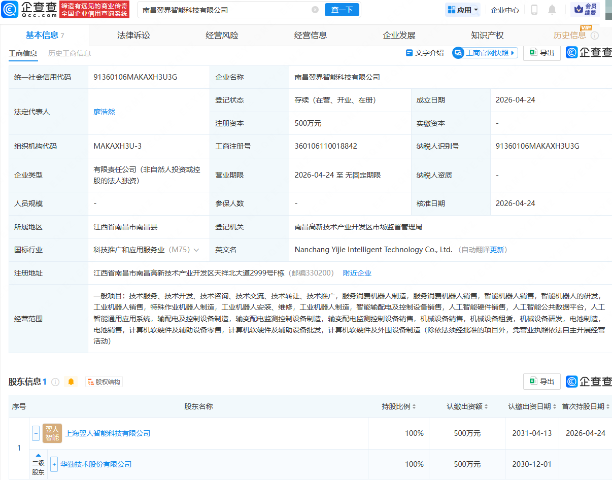 企查查APP显示,近日,南昌翌界智能科技有限公司成立,法定代表人为廖浩然,经营范围包含:服务消费机器人制造,服务消费机器人销售,智能机器人销售,智能机器人的研发,工业机器人销售等性感骚气美女网站视频。企查查股权穿透显示,该公司由华勤技术(603296)间接全资持股性感照如何拍。